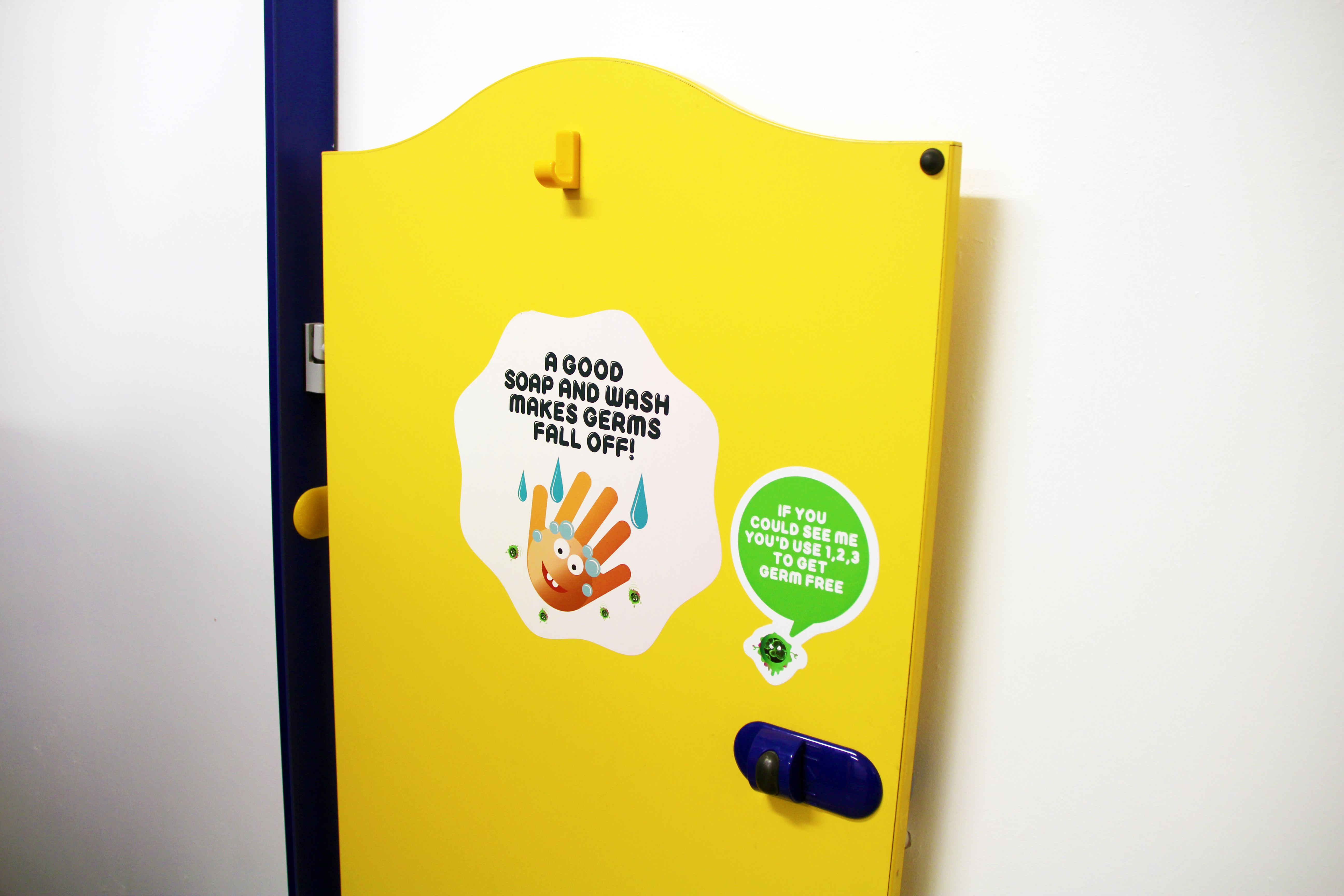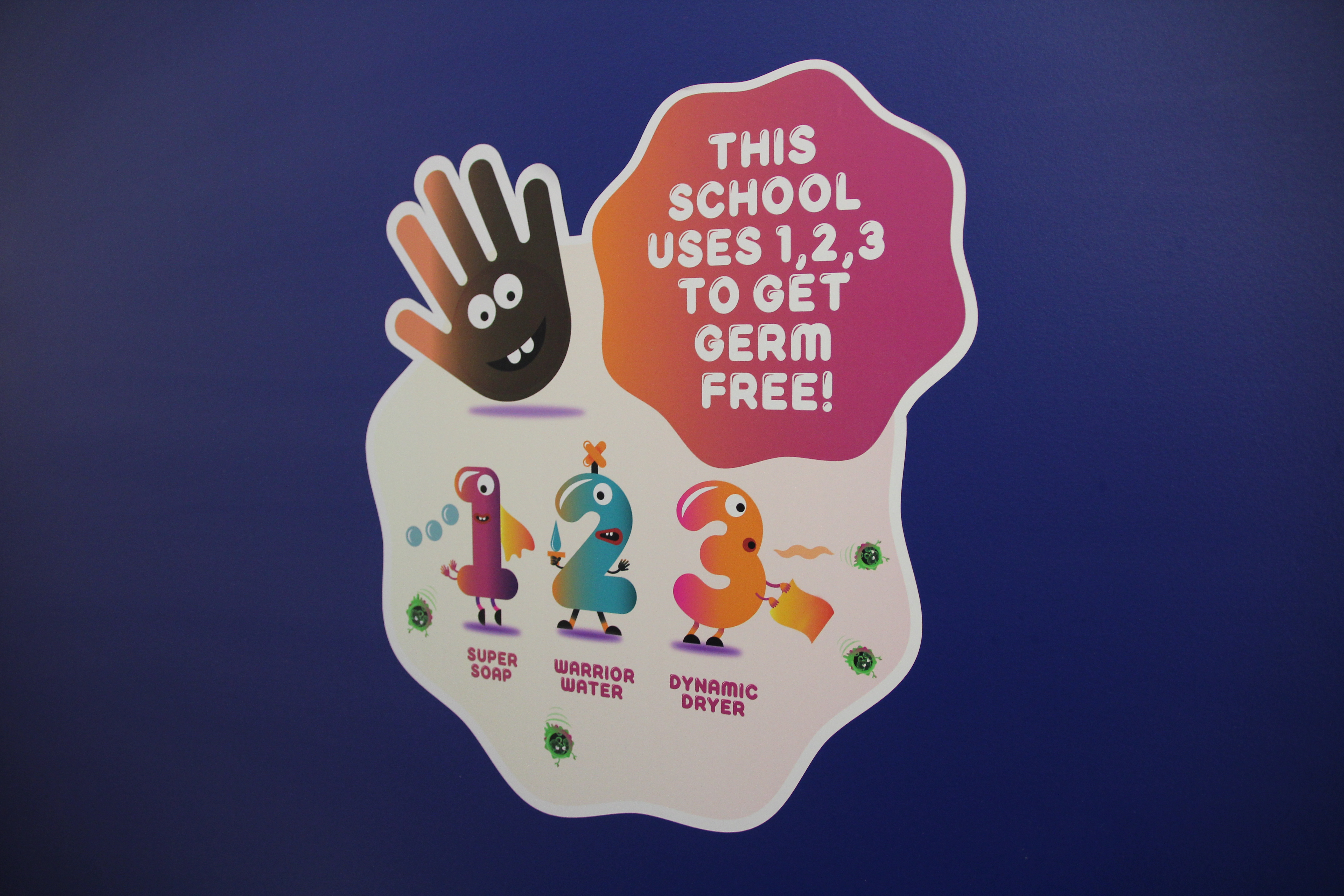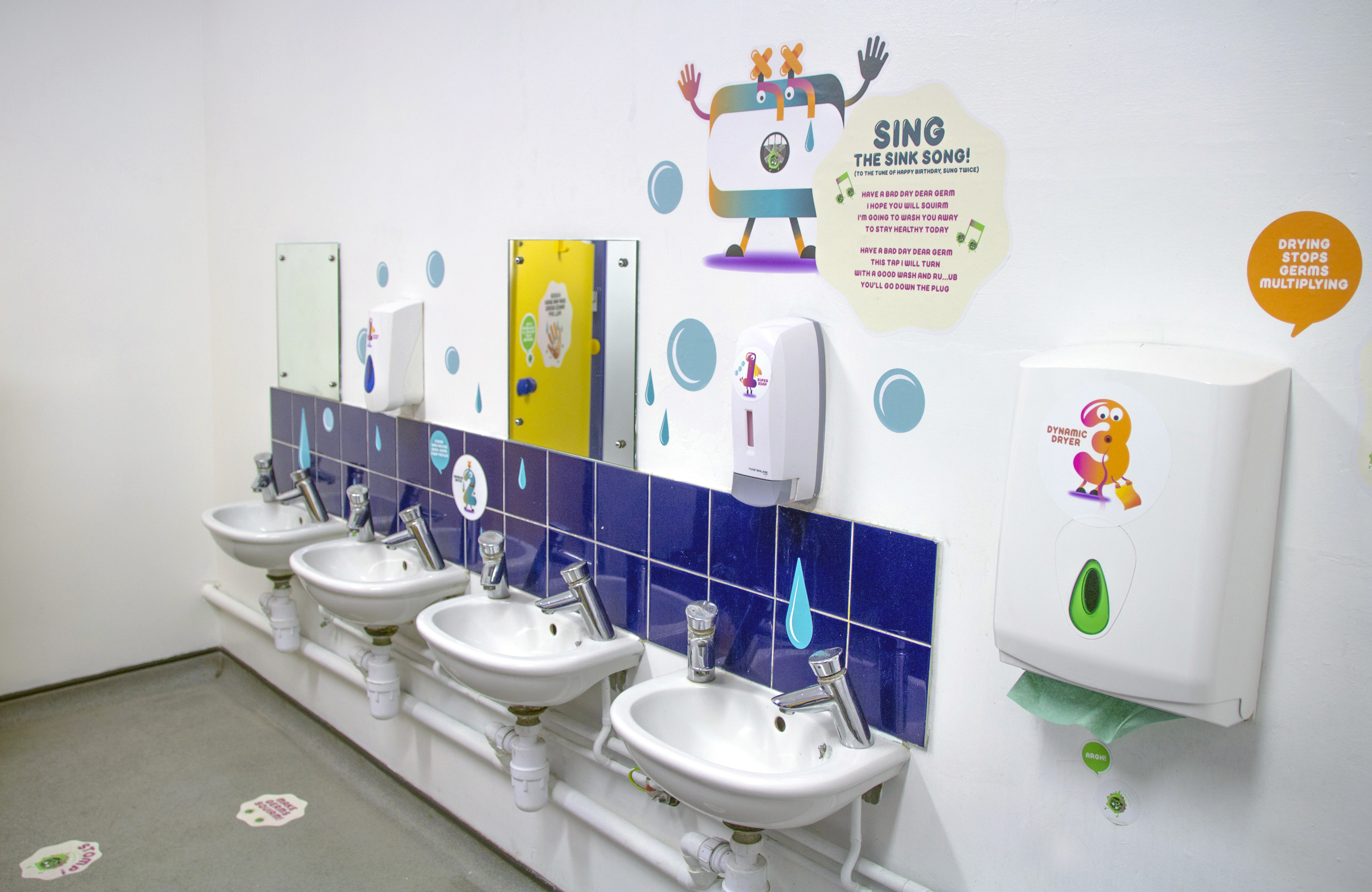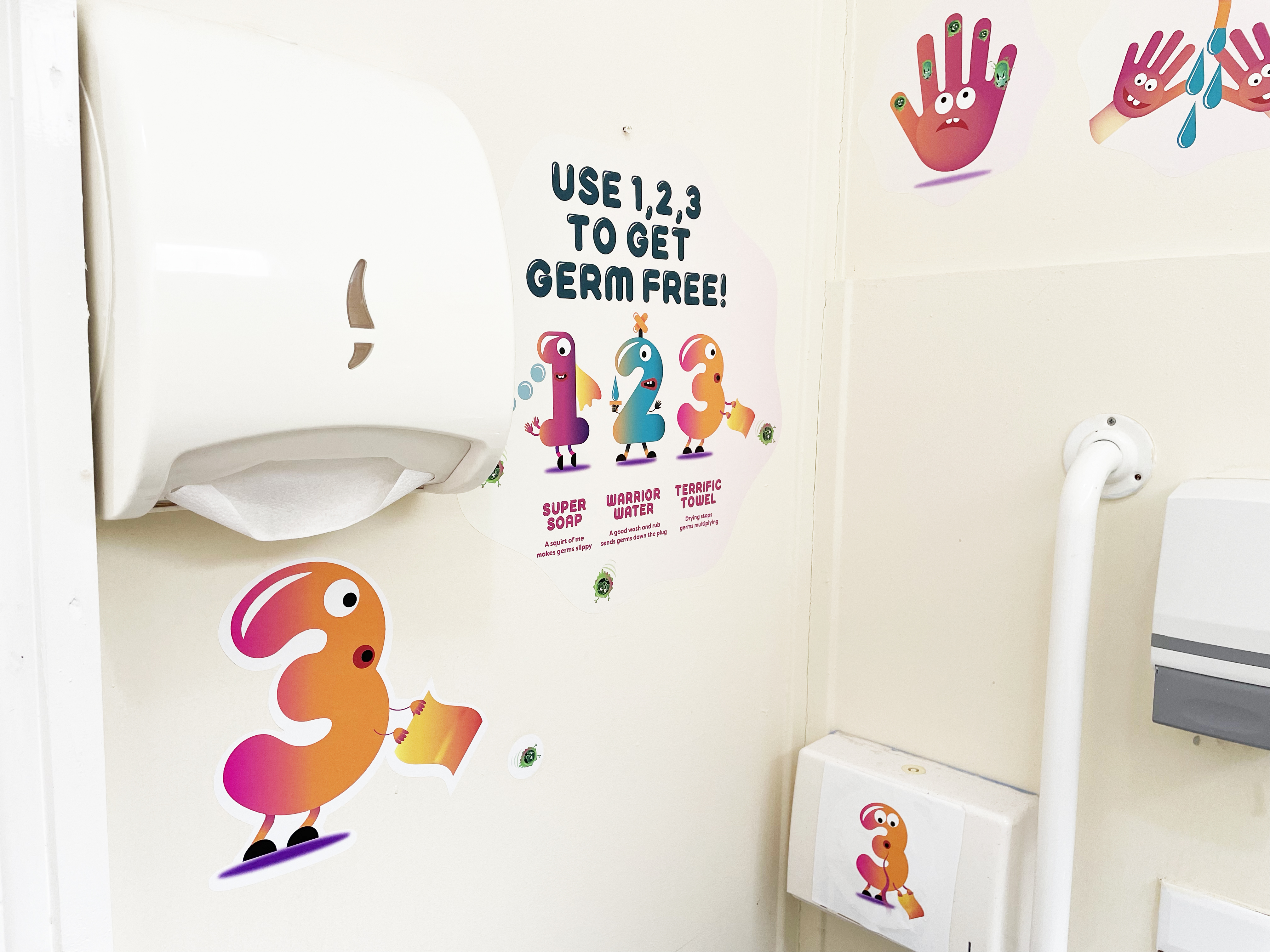 Developed by the University of Leeds with the help of primary school children and teachers, ‘123 Germ Free’ brings colour and fun messaging to your toilet spaces. You can download printable designs for free or purchase ready-printed vinyl stickers. We also provide free classroom and home activities for bringing hand
