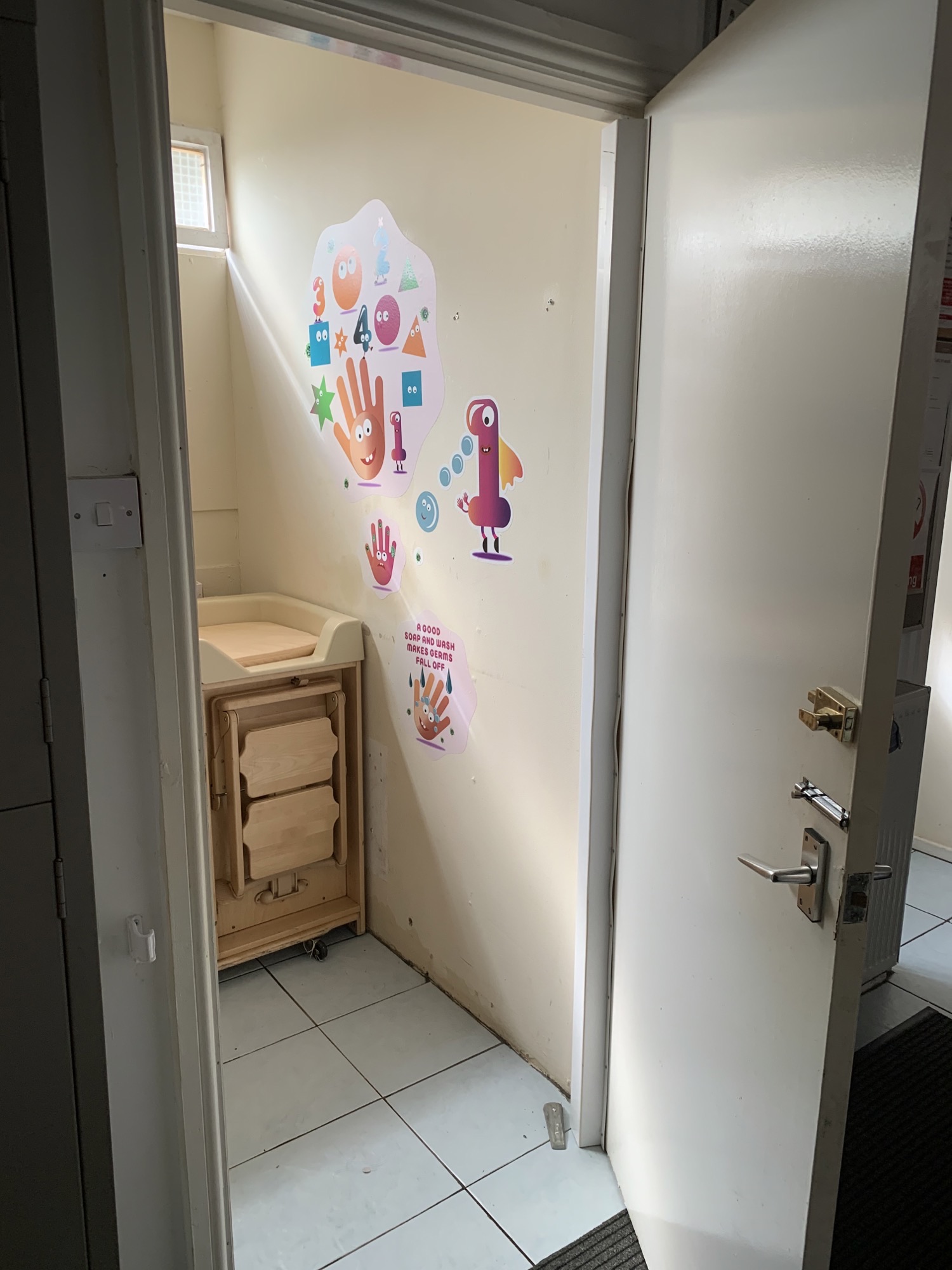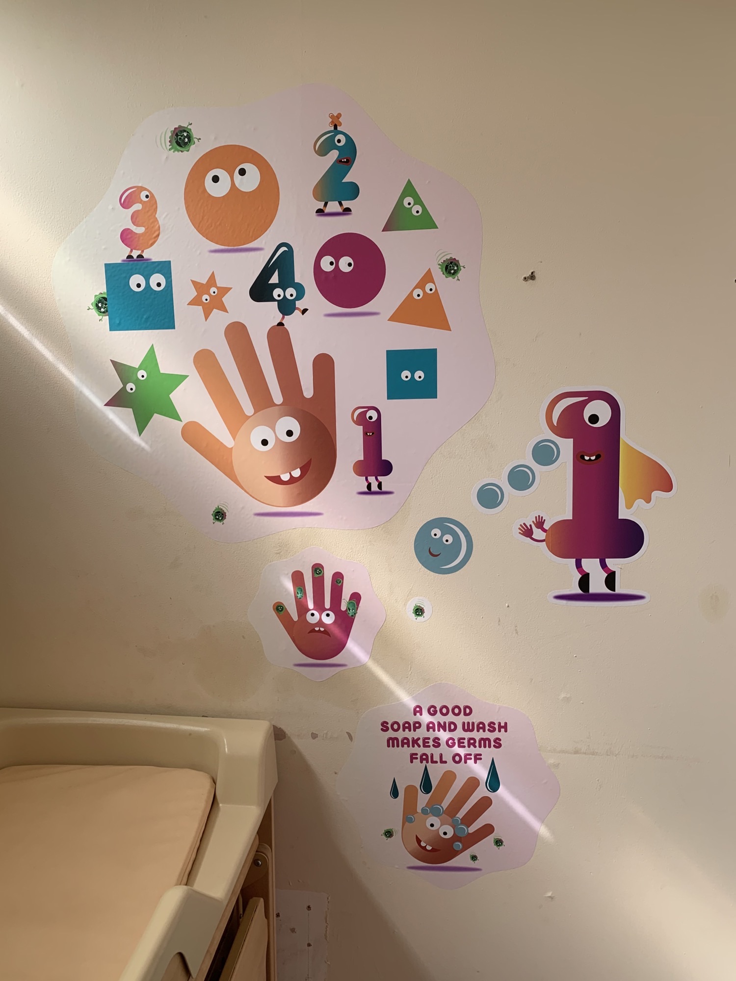Kidspiration are a small family oriented nursery for 2-3 year olds. Our aim was to see how well the children were responding to the graphics and whether they were encouraged to wash their hands. The graphics instantly brightened up the space and created a more inviting environment. Our challenge was to motivate the children to be in the toilet space wash their hands without having them be in there for too long.
