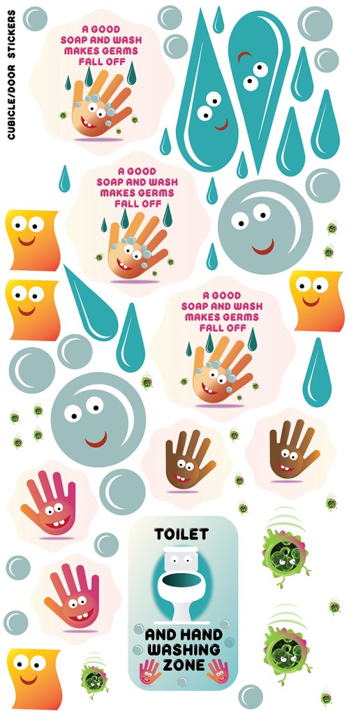 We call these motivational moments. Stick one big sticker and one small sticker at the toilet end or the back of the door! Stick a germ near each cubicle door handle.