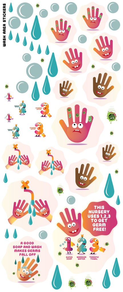 Put the 1,2 and 3 character-stickers and their speech bubbles on or directly above the soap dispenser (1), near the taps (2) and on the dryer (3).
