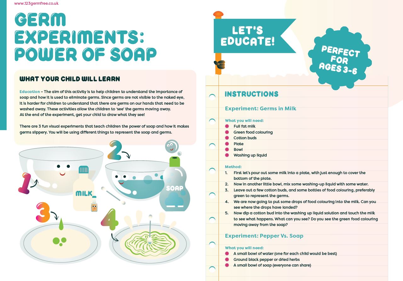 Teach children all about handwashing with these creative activities. There are two fun activities to help get their creative juices flowing through designing and colouring in. You can even take a photo of their creations and share it with us on our social media platforms using our hashtag #123germfree